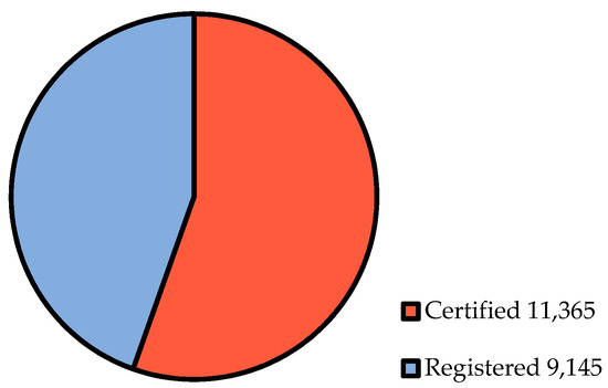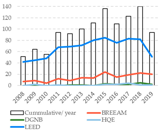 To obtain reliable data on the number of certificates from the most representative GBRSs in the EU, this research gathered data from official websites like BREEAM [37], DGNB [54], HQE [63], LEED [64], MILJOYGGNAD [56], MINERGIE [50], and TQB-2010 [52]. For those with no available data on their websites, it was necessary to proceed with a consultation process [64,65,66,67,68], carried out on 31 July, 2019. EDGE [69] and VERDE [48] responded with a detailed list of certified and registered buildings as requested. Some others neither published detailed data on the website nor sent requested information, like ITACA and SBToolCZ. Fortunately, there were only a few of them and most likely those with a smaller number of certificates across the whole EU. Future updates of this work will probably include more comprehensive data about these minoritarian GBRSs.