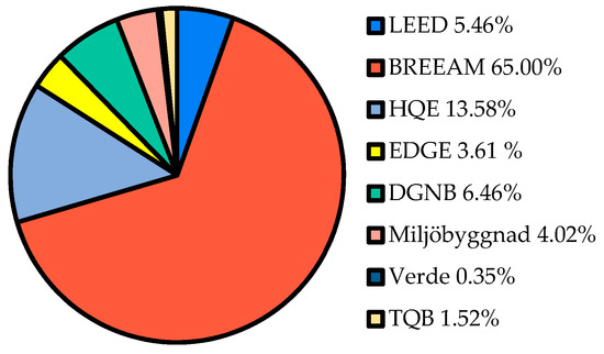 According to the methodology explained in Figure 3, consultations and web searches provided a comprehensive spreadsheet that was transformed into Figure 6 and Figure 7. Figure 6 includes a comparison between registered buildings (9145) and those that finally obtained certification (11,365). On the right side, Figure 7 includes a GBRS certification breakdown including the most widely used GBRSs within the EU: BREEAM (65.00%), HQE (13.58%), DGNB (6.49%), LEED (5.46%), Miljobyggnad (4.02%), EDGE (3.61%), TQB (1.52%), and VERDE (0.35%). These results form the basis that support the GBRS selected for this research.