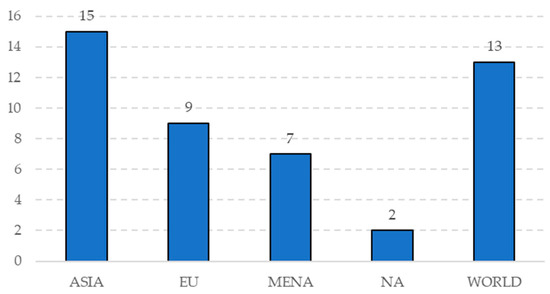 According to the geographical context of this research, which is the EU, selected research papers were classified by areas included into the study, as seen in Figure 13. GBRSs are highly affected by local conditions, and this is a matter of importance for many authors who work with the aim to provide improvements based on regional adaptations. Asia shows the highest figure, while North America (NA) had the lowest, with the EU and the Middle East and North Africa (MENA) in the middle. Looking at the whole picture, 33 out of 46 papers provided a geographical contextualization while 13 out of 46 did not. Therefore, the majority of authors published papers focused on a region.