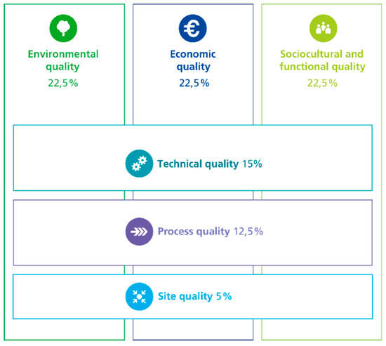 DGNB was launched in 2009 by the Deutsche Gesellschaft für Nachhaltiges Bauen (DGNB). In 2014, an international version was released [13], but its latest versions was only just released in November 2019, coinciding with the writing of this paper. According to data obtained through the methodology explained in Figure 3, in July 2019, it showed 924 registered buildings including 734 already certified buildings, which ranks it in fourth position of the GBRS in terms of the number of certified buildings. The DGNB system includes three equally weighted categories regarding three of the most commonly accepted sustainability pillars [13,14,19,81], which are environmental, economic, sociocultural, and functional quality (see Figure 14). The DGNB system includes three other categories with less importance as the weighting factors: technical, process, and site quality. Furthermore, 10 ISS and 38 CRS with corresponding IDS are included. IDS acts as the UOI in the DGNB. The final score depends on the weighting methodology as stated in Figure 5. Weighting of these criteria is different according to the building typology.