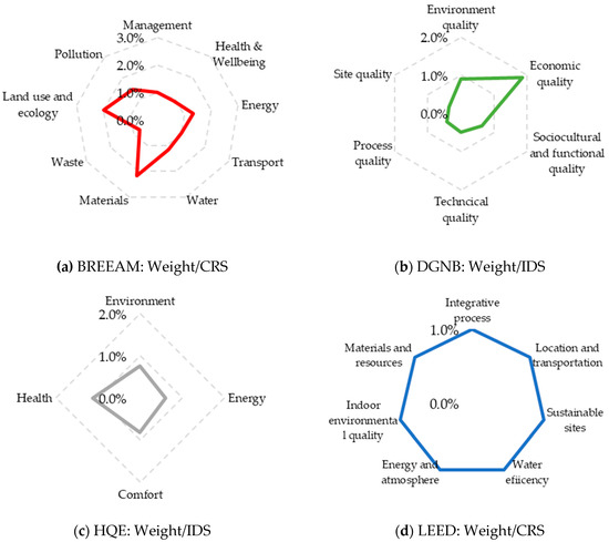 Most of the common GBRS scoring methods are summarized in Figure 5, where the structure follows BREEAM and LEED details in terms of the UOI. According to a bottom–up scoring system, points obtained by criteria accomplishment provide each category score. In BREEAM, the score is weighted by a different coefficient per category while in LEED the coefficient is 1. The DGNB and HQE scoring system is similar to BREEAM and LEED, however their UOI is an indicator. Later, a cumulative scoring process was carried out to obtain the global mark that these IDS would produce in theory.
