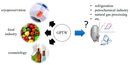 The possibilities of using GPTW are shown in Figure 1. The use of GPTW has already been reported in relation to disinfection [24] and the cryopreservation of biological samples [25]. This type of water is also used in cosmetology, due to the possibility of dissolving more chemical compounds, and even allows the dissolution of compounds that are practically insoluble in plain water, which makes it possible to obtain highly-concentrated aqueous solutions of active substances. The food industry is the third branch in which GPTW is used [26,27], as it improves microbiological safety, stimulates plant growth, and increases the nutritional value [28,29,30]. However, to the best of authors’ knowledge, no studies have been conducted to determine the possibility of using GPTW in industries using water as a cooling medium, for example in absorption or adsorption systems. In contrast to magnetic treated water, it was experimentally determined that low-pressure glow plasma may influence some of the physical properties of water such as pH, electric conductivity, and surface tension (Table 1). It was concluded [31] that the macrostructure of water is deteriorated due to exposure to plasma. However, an in-sight analysis of the papers related to the physical properties of water treated with plasma shows that there is no clear trend in its behavior. Most studies show that the pH for plasma-activated water increases. Similarly, the electrical conductivity increases, which may be associated with the formation of hydrogen and nitrate ions [32]. The density and viscosity of water are almost constant. The greatest discrepancy in the results was obtained for surface tension, where Mystkowska et al. [33] showed a significant increase (by over 30%), while studies [31] did not show a significant change.