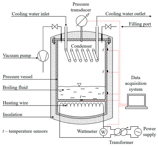 Studies of the boiling process were carried out on an experimental bench shown in Figure 2. It was composed of two brass flanges and a stainless steel tube with a diameter of 80 mm and a length of 300 mm. The boiling process of the substance occurred inside the tube, on a flat bottom flange made of brass, with a roughness of 0.05. Under the boiling surface, there was a flat heating element in the form of a resistance wire embedded in a heat-resistant mass. Current heating power was determined using an autotransformer, and measured with a wattmeter. Heat collection and the condensation of water took place in the upper part of the stand. The condenser was a copper multi-turn spiral with a diameter of 60 mm, through which cooling water flowed. The whole bench was insulated with polyurethane foam. A total of six temperature sensors for measuring the temperature of the heating surface (resistance thermometer PT100, 1/3 DIN), the temperature of the stainless steel tube (three thermocouples type K, class 1), and the temperature of the cooling water at the inlet and outlet from the condenser (two thermocouples type K, class 1) were installed in the stand. The vacuum value was measured with an absolute pressure gauge, together with a transducer, the Keller-Druck PAA33X-EV-120.