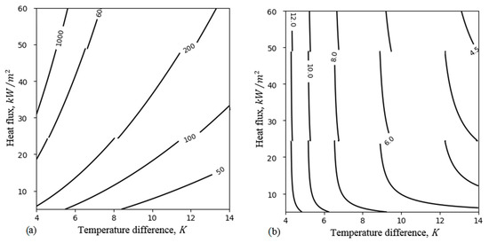 The values of measurement errors of the HTC, depending on the temperature difference and the heat flux density, are shown in Figure 3. The graph presents the absolute error values (on the left) and the relative error values, expressed as a percentage of the base value (on the right). The discontinuities in both graphs result from the use of a wattmeter with a variable measuring range. The change in the measuring range resulting from the increase in heat flux density caused jumps in the measurement errors for certain conditions. Maximum measurement errors (except for points in the natural convection area, i.e., for a temperature difference below 5 K) did not exceed 10%.