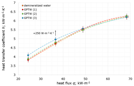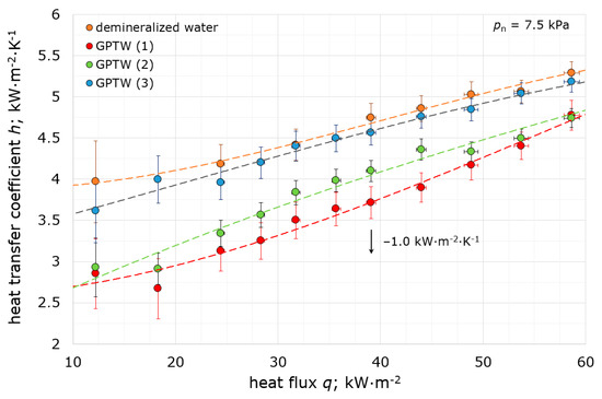 Figure 6 presents the results of measurements of the HTC for demineralized water and the tested samples of GPTW during boiling at reduced pressure (equal to 7.5 kPa). During the tests, the GPTW (1) obtained the lowest values of the HTC for the heat flux density range up to 60 kW/m2, whereby the course of the boiling curve for demineralized water was maintained. The measuring points for the GPTW (2) also shifted downwards to the lower values of the HTC for a given heat flux density. In turn, the measuring points for demineralized water and the GPTW (3) almost overlapped. The values obtained for these two samples fell within the range of measurement errors. Large measurement errors in the range of low HTC and q values were caused by a relatively large measurement error of the temperature difference between the heating surface and the working medium. At the same time, the flattening of the measuring points for a heat flux of up to about 20 kW/m2 suggested that no nucleate boiling took place, but only natural convection in the liquid volume.