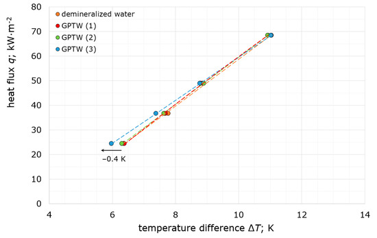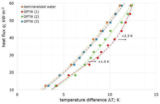 The boiling curves of GPTW at reduced pressure are presented in Figure 7. The transition from the natural convection area to nucleate boiling occured later for samples of GPTW (1) and (2). Compared to demineralized water, the transition point was shifted by around 2.3 K and 1.5 K to the right, respectively. This resulted in a decrease of the boiling HTC, as illustrated in the previous graph.