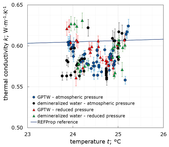 Most of the experimental results obtained (Figure 8) are below the reference line (REFProp data). The presented results show the lack of a clear trend regarding the thermal conductivity of GPTW in relation to deionized water, both at atmospheric and reduced pressure. The experimental values ranged from 0.558 to 0.631, which is consistent with the information provided for water in physical tables. The average values for GPTW and deionized water, respectively at atmospheric and reduced pressure, were 0.586, 0.593, 0.583, and 0.593 W/(mK).