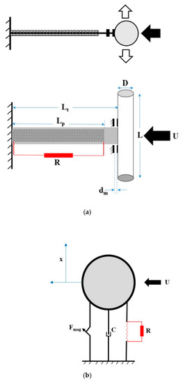 The energy harvesting system under consideration consists of a cantilevered beam with a cylinder perpendicularly attached at its free end, as shown in Figure 1a. The two in-plane electrodes of unimorph piezoelectric layer adhered on each side of the beam are connected to an external electrical load resistance R. Lp represents the length of the beam covered with the piezoelectric layer while Lt denotes the total length of the beam. The thickness of piezoelectric sheet is negligible, and the electrodes are assumed to be perfectly conductive. The objective is to produce a compressive force on the beam to cause buckling behavior. Therefore, a pair of attractive magnets is introduced to result in buckling of the piezoelectric beam at a certain spacing distance (dm) between magnets. It is noted that the induced magnetic force can be used to switch the energy harvester between monostable and bistable characteristics depending on the spacing distance [12]. Consequently, the focus of this study is to comparatively investigate the dynamics and performance of VIV-based energy harvester in monostable and bistable configurations.