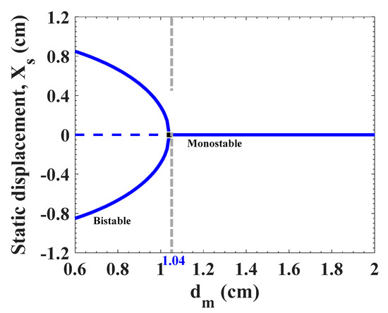 The dependence of the static displacement on the spacing distance is presented in Figure 2. It can be clearly seen that there is a critical distance (dm_cr) between the magnets where the equilibrium of the system is changed. When dm > dm_cr, there is a zero stable equilibrium solution () showing that the energy harvesting system is working in the monostable region. As dm < dm_cr, the central zero line becomes unstable resulting in a bistable configuration. The graph in Figure 2 also shows that a further decrease in the spacing distance dm in the post-buckling scenario causes an increase in the static equilibrium displacements in a symmetric way.