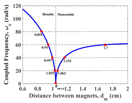 It is noted that the modified coupled frequency depends upon the static position xs of the system. In addition, inspecting Equation (6), we note that for the monostable scenario, when the static displacement xs is zero, the modified frequency is directly proportional to the spacing distance dm between magnets as shown in Figure 3.