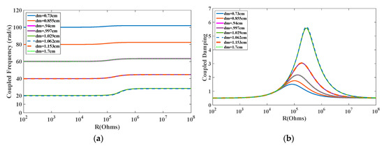 Variations of the (a) coupled frequency and (b) coupled damping ratio with load resistance R for different values of spacing distance offered in Table 1.
