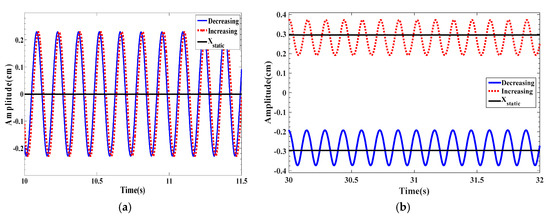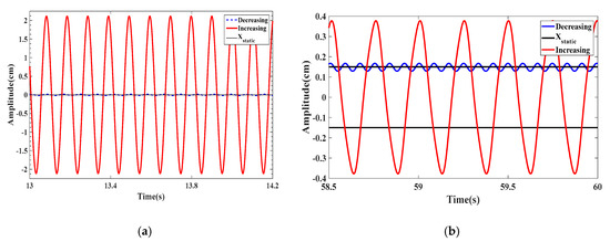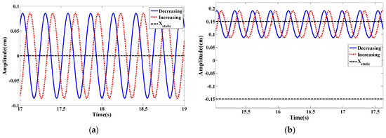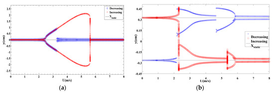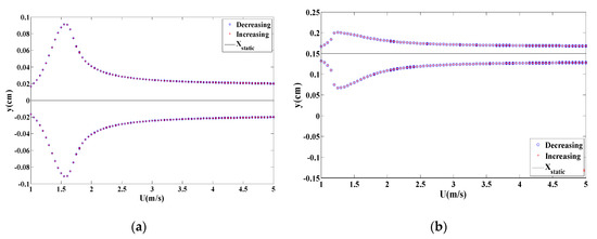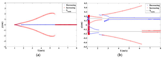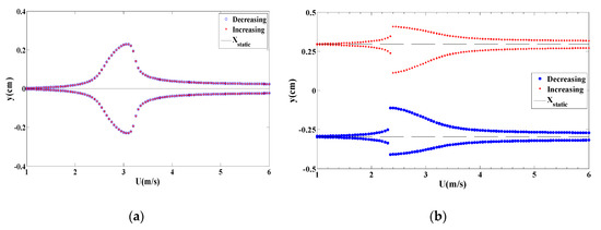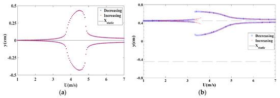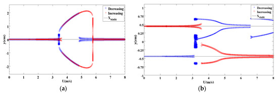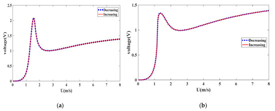 To make a better comparison, bifurcation diagrams for the displacement amplitudes of the energy harvester are presented when dm = 1.062 cm for the monostable configuration given in Figure 6a while dm = 1.029 cm for the bistable configuration offered in Figure 6b. The bifurcation diagrams clearly depict a synchronization region for each configuration. The decreasing process is used, that is to say, the wind speed is gradually decreased from the maximum value (U = 5 m/s in this case) to 1 m/s. It is important to mention that during the decreasing process, a high initial condition of x = 2 cm for the first cycle is used. After obtaining the amplitude, we use the updated displacement amplitude as the initial condition for the rest cycles. Similarly, in the increasing process, the wind speed is slowly increased from 1 m/s to 5 m/s. The initial condition for the first cycle is x = 10−6 m. Then, the updated amplitude is utilized from the previous cycle as the initial condition for the next cycle. It is found that the dynamic responses of the energy harvester in the forward and backward sweep are identical however the output levels are almost double in case of monostable configuration as compared to that in the bistable one. Also, it is noted that a softening behavior takes place in the bistable configuration while a hardening behavior takes place in the monostable configuration with negligible sharpness. This can be attributed to higher coupled electromechanical damping when selecting the load resistance of 105 Ω which is able to reduce the effects of nonlinearities in both configurations with a reduction in the oscillating amplitudes and hence the levels of the harvested power.