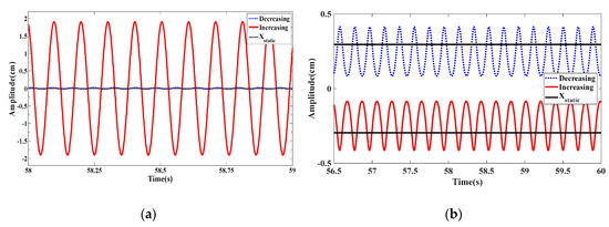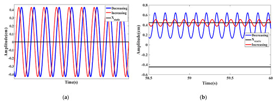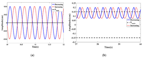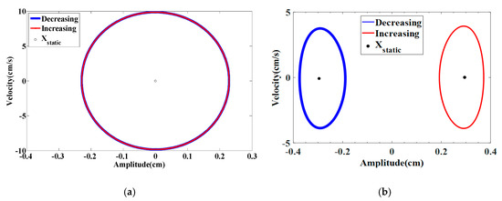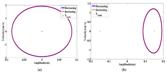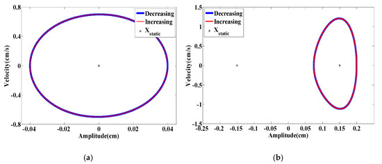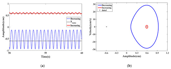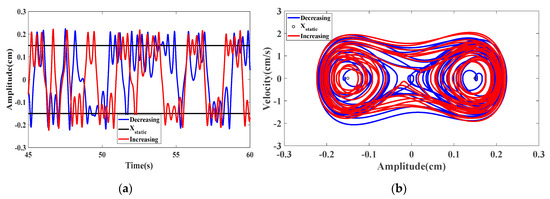 The increasing/decreasing bifurcation diagrams for the displacement amplitudes are presented in Figure 20a when dm = 0.855 cm in which the blue curve shows that decreasing the wind speed from higher initial conditions gives a significant broader synchronization region compared to that in the case of increasing scenario from low initial conditions as depicted by the red curve. A significant softening behavior takes place and it can also be noted that the energy harvester vibrates around different equilibrium positions in the case of increasing and decreasing scenarios. The plotted curves in Figure 20b show the variations of the RMS generated voltage as a function of the wind speed. The softening behavior with a hysteresis region is more prominent than the previous cases. This case is beneficial for optimizing the energy harvester in high wind speed conditions. Figure 21a,b shows, respectively, the time history and phase portrait in the hysteresis region at U = 4.4 m/s. The difference in vibration amplitude for increasing and decreasing scenarios is quite prominent.
