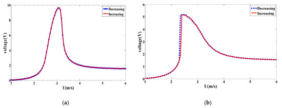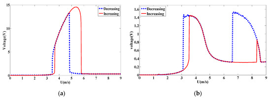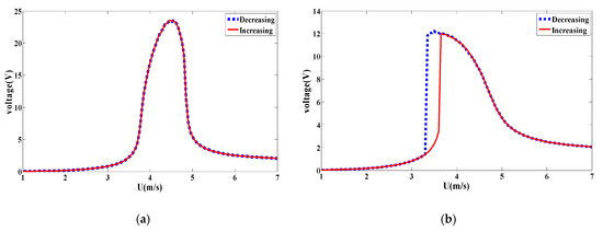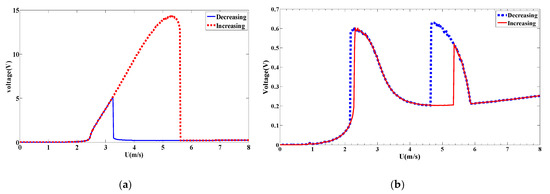 When the coupled frequency is further increased to 60 rad/s, the increasing/decreasing bifurcation diagrams for the monostable and bistable configurations are plotted in Figure 29. It follows from these plots that the hardening behavior with a broadband synchronization region is clearer between wind speed of 3 m/s and 6 m/s in the case of monostable configuration. While for the bistable configuration shown Figure 29b, a softening behavior with a shift of synchronization region is obtained. The plotted curves of the RMS generated voltage for both monostable and bistable configurations are shown in Figure 30.