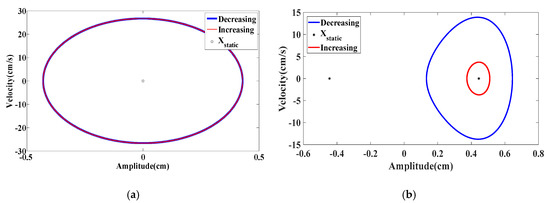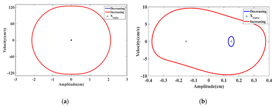 Phase portraits at U = 3.1 m/s for (a) monostable configuration at dm = 1.153 cm while (b) bistable configuration at dm = 0.997 cm.