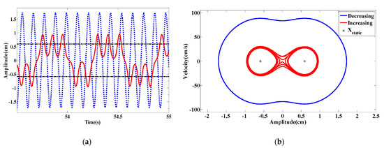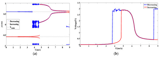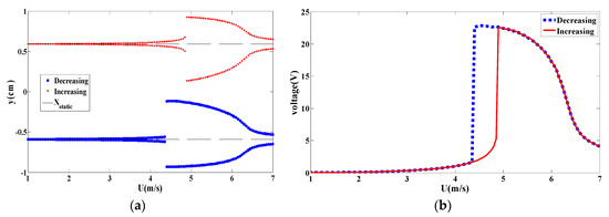 As the coupled frequency is as large as 80 rad/s, the energy harvester is only in the bistable configuration. In this case, the bifurcation diagrams for displacement amplitude are shown in Figure 31a and the RMS output voltage as a function of the wind speed is plotted in Figure 31b. Obviously, the results show a significant softening behavior and a wider hysteresis region. Inspecting the plotted curves in Figure 31a, we note that when the wind speed is around 4 m/s, the results are very interesting with quick switches of the displacement between the two equilibrium positions. To further investigate this behavior around 4 m/s, the time histories and phase portraits are plotted in Figure 32a,b, respectively. Clearly, when increasing the wind speed, intrawell oscillations take place with low amplitudes. On the other hand, when decreasing the wind speed, interwell oscillations are present and hence higher values of the displacement and generated voltage are produced.