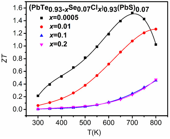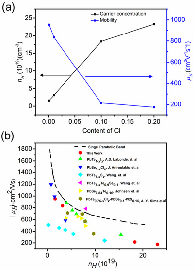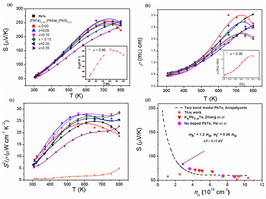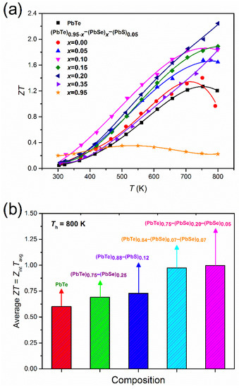 - Li, X.X.; Li, J.Q.; Liu, F.S.; Ao, W.Q.; Li, H.T.; Pan, L.C. Enhanced thermoelectric properties of (PbTe)0.88(PbS)0.12 composites by Bi doping. J. Alloys Compd. 2013, 547, 86–90. [Google Scholar] [CrossRef]