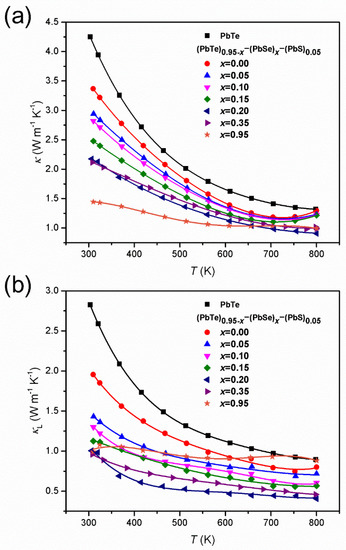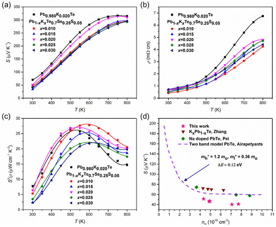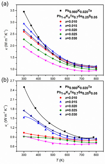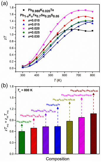 - Ginting, D.; Lin, C.-C.; Rathnam, L.; Yu, B.-K.; Kim, S.-J.; Al Rahal Al Orabi, R.; Rhyee, J.-S. Enhancement of thermoelectric properties by effective K-doping and nanoprecipitation in quaternary compounds of (Pb1−xKxTe)0.70(PbSe)0.25(PbS)0.05. RSC Adv. 2016, 6, 62958–62967. [Google Scholar] [CrossRef]