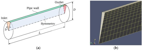 For solving the coupled flow and heat transfer problem described by transport Equations (1)–(3) and the constitutive relations (4)–(10), boundary conditions are prescribed at domain boundaries (pipe inlet, pipe outlet, and pipe wall, with reference to Figure 2). The boundary conditions are summarized in the following.
