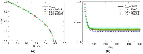 The model is verified for a pure fluid, without nanoparticles, against the known analytical solution [], the experimental results [], and the empirical result []. In the computational setup, the pipe geometry and fluid (water) properties are the same as in [], with the Reynolds number of the flow Re = 965, the wall heat flux q = 1000 W/m2 and the temperature of the fluid at the inlet is Tin = 293 K, as listed in Table 1. The fluid in these simulations is Newtonian and the viscous stress tensor is calculated as , instead of using the Herschel-Bulkley model. There meshes were used for the verification: 200 × 5, 400 × 10 and 800 × 20 cells in the axial and radial directions, respectively. Figure 3 shows the computationally obtained velocity profile and the friction factor for the laminar flow of water. The results for both, the velocity profile and the friction factor, converge with increasing mesh resolution.