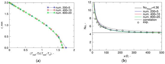 The computed local Nusselt number and the dimensionless radial temperature profile in the pipe cross-section are plotted in Figure 4. The computationally obtained results converge with decreasing the mesh size in both, the dimensionless radial temperature distribution and the Nusselt number. The analytical solution for the Nusselt number Nu = 4.36 is also correctly evaluated and the computational results for the Nusselt number are in very good agreement with the experimental results in [] and also the empirical result from [].