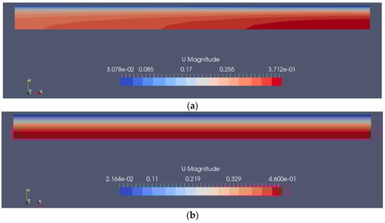 The computed velocity distribution (expressed in m/s) for laminar flow of water at Re = 965: (a) Inlet part of the pipe; (b) Outlet part of the pipe.
