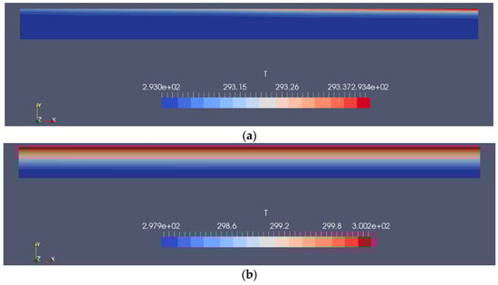 The computed temperature distribution (expressed in K) for laminar flow of water at Re = 965: (a) Inlet part of the pipe; (b) Outlet part of the pipe.