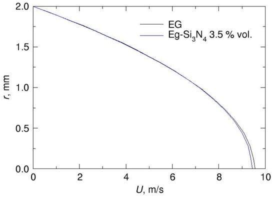 The computed velocity profile for laminar flow of pure EG and of EG-Si3N4 nanofluid with the nanoparticle volume fraction of 3.5% at Q = 6 × 10−5 m3/s, which corresponds to Re = 1500 for pure EG.