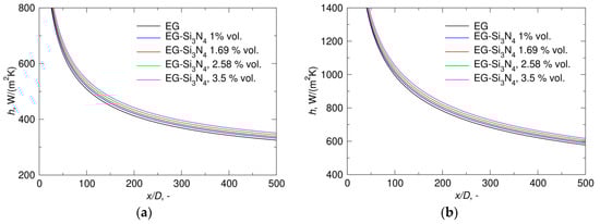 Computational results for laminar flow of EG-Si3N4 nanofluid with various nanoparticle volume fractions and the imposed wall heat flux q = 10 kW/m2: (a) Heat transfer coefficient at the volume flow rate of Q = 8 × 10−6 m3/s, which corresponds to Re = 200 for pure EG; (b) Heat transfer coefficient at a volume flow rate of Q = 6 × 10−5 m3/s, which corresponds to Re = 1500 for pure EG.