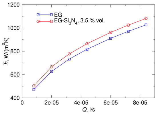 The computed heat transfer coefficients of EG as base fluid and of EG-Si3N4 with different nanoparticle volume fractions are plotted in Figure 8 for the volume flow rates Q = 8 × 10−6 m3/s, which corresponds to Re = 200 for EG, and for Q = 6 × 10−5 m3/s, which corresponds to Re = 1500 for EG. It can be observed that the heat transfer coefficient in the nanofluid is higher than the one in the pure base fluid, and the increase of the volume fraction of the nanoparticles leads to the increase of the heat transfer coefficient.