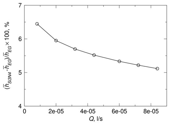 Finally, the computational results for the relative enhancement of the average heat transfer coefficient for the EG-Si3N4 nanofluid at the volume fraction of nanoparticles of 3.5% over a range of nanofluid volume flow rates corresponding to Re between 200 and 2100 for pure EG are shown in Figure 10. The relative enhancement of the average heat transfer coefficient is higher at lower flow rates and amounts to 6.5% at the lowest flow rate, while the enhancement is slightly decreasing at higher flow rates. This is attributed to the fact that at higher flow rates the heat transfer coefficient of the pure base fluid is also increased, which slightly damps the relative enhancement.