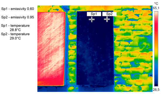 Since there are no unequivocal emissivity values for individual polystyrene boards (no declarations in this respect offered by manufacturers), a testing study was carried out. The emissivity of the expanded polystyrene boards (panel B) was determined using a comparative method with respect to the reference tape of the known emissivity of 0.96. The emissivity of the panel B determined on that basis was 0.95, and basing on the literature [27], for white polystyrene (panel C) the emissivity is assumed to be 0.60. In order to determine the impact of the adopted emissivity value on the temperature distribution on the surface for the white polystyrene, a thermographic measurement was made. Two measurement points Sp1 and Sp2 were selected, at which the emissivity values of 0.60 and 0.95 were assumed, respectively. The results are presented in Figure 1.