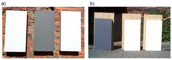 Frequently, graphite is applied for expanded polystyrene composites [20], which improves the capacity of energy storage [21]. The described problems involving the impact of temperature on polystyrene with thermal additives have been discussed by various research teams [22,23,24]. There is relatively little information on the scale of the issue under consideration. Based on the Polish literature, we can find information that, among others, relates how rapid changes of temperature on the surface of ‘black polystyrene panels’ contribute to their damage on building facades, in particular from the south. In other works in Poland, the issue involving the impact of solar radiation was investigated both in laboratory and natural conditions, as well as in numerical simulations. It was found that the temperature on the surface of polystyrene under intense solar radiation may surpass the softening point. In addition, it may result in the deformation of the thermal insulation boards, which can bring about the detachment of the polystyrene boards from the wall surface. Exposing the material to excessive, direct solar radiation may damage polystyrene. The said problem was pointed out by Kussauer and Ruprecht [23] in their monograph.