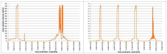 The results were recorded at both measuring stands. As part of the measurements, the maximum temperatures, obtainable on a given day, on the surface of the analyzed polystyrene panels, were determined. During the tests, the position of the polystyrene panels on the mobile stand was being adjusted in such a way as to ensure the highest possible load of the tested panels with solar radiation. Simultaneously with the thermographic measurements, the measurements of solar radiation intensity (W/m2) were carried out. The studies were conducted in the period from 12 September 2018 to 22 September 2018.