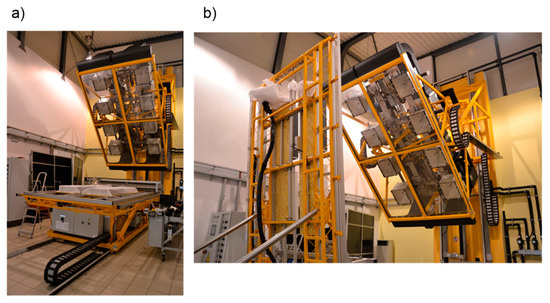 A solar radiation stimulator (artificial sun) is a stationary complex system of devices that enables the generation of radiation in laboratory conditions which reflects the emission of solar radiation. The simulator consists of a field of lamps, artificial sky, temperature sensors and data generation devices. The main element of the research station is made up of eight metal halide lamps of the total power of 32 kW, enabling the simulation of natural solar radiation. The design of the device allows precise positioning of the tested object and the field of lamps, ensuring angle adjustments in the range of 0°–90°. In that way we can imitate the actual ‘journey’ of the sun on the horizon (Figure 7).