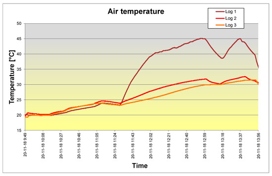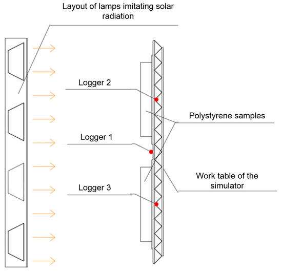 The logger No.1 was placed between the tested polystyrene panels (in the middle of the simulator’s work table) from the side of the lamps (artificial sun). The logger No.1 was covered with a layer of aluminum foil from the side of the lamps, which allowed us to eliminate the direct influence of solar radiation on the recorded results of the room climate. The recorders nos. 2 and 3 were placed in the plane of the tested polystyrene samples under the simulator’s work table. The logger No. 2 was located in the upper part of the work table, while the logger No. 3 in its lower part. The measurement time step was set at 10 s. Figure 9 and Figure 10 present the measurement results.