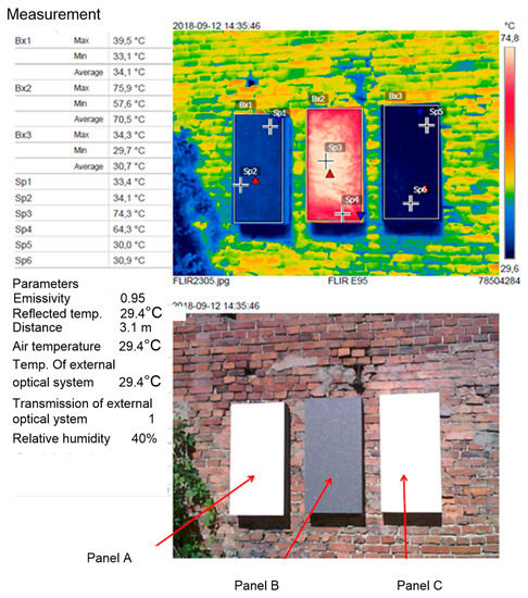 The temperature values obtained on the surface of white polystyrene for two different measurement points of different surface emissivity differ from each other by 0.2 °C. The difference is lower than 1% of the measured values. It bespeaks of the fact that the change of emissivity for white polystyrene (panel C) under solar radiation conditions does not significantly affect temperature distribution on the surface of the polystyrene board. Therefore, there was no need to determine the exact emissivity value for the white board, which is why, for the purpose of comparison with panels A and B, the emissivity value of 0.95 (value determined for panel B) was adopted for all three panels.