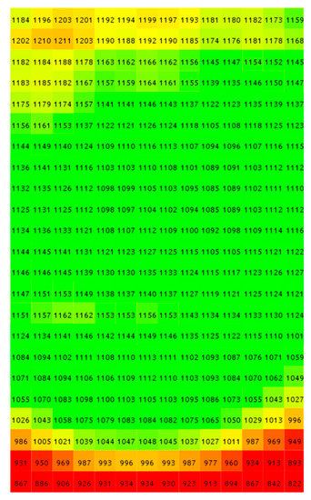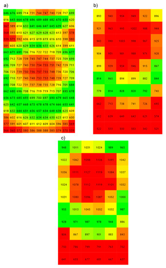 Distribution of solar radiation intensity on the surface comprising the tested samples. (a) distribution for artificial sun slope of 43.28°—minimum intensity 665 W/m2, maximum 757 W/m2, medium 665 W/m2, (b) distribution for artificial sun slope of 21.0°—minimum intensity 521 W/m2, maximum 1005 W/m2, medium 827 W/m2, (c) distribution for artificial sun slope of 16.28°—minimum intensity 637 W/m2, maximum 1127 W/m2, average 955 W/m2.