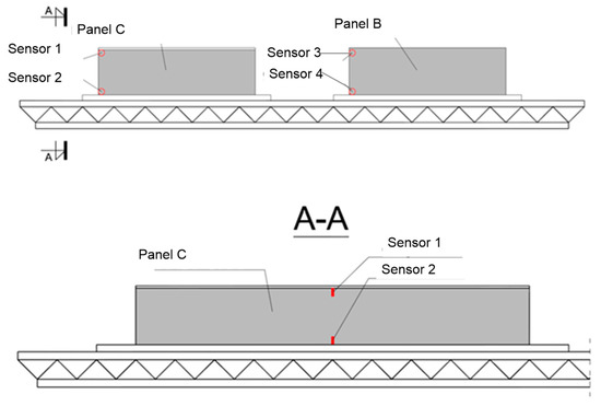 In order to examine the distribution of temperature inside the panels, two temperature measurement sensors were placed on the lateral planes of the panels. The sensors were arranged in such a way (see Figure 14) to examine the impact of the protective layer of panel A on temperature distribution inside it as compared to panel B.