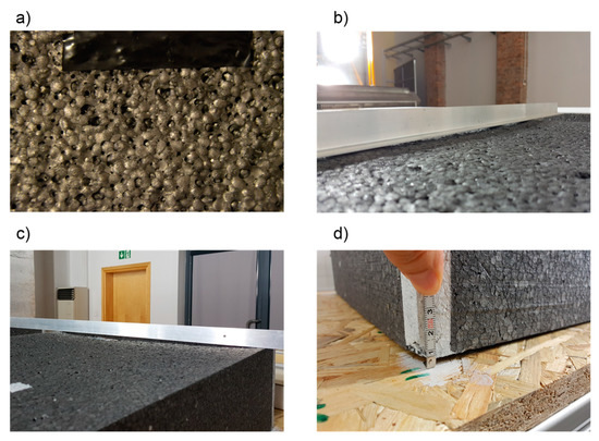 Damage to panels B. (a) loss of polystyrene granules in effect of exceeding the softening temperature, (b) and (c) deformation of the panel due to the exposure to artificial sun, (d) panel edge raised away from the ground.