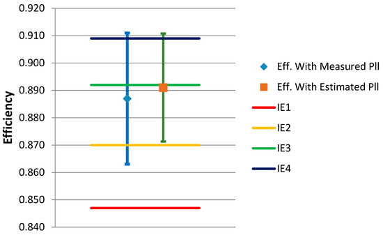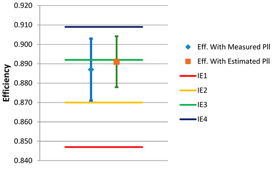 The two different measurement methods lead to the same IE efficiency rating of the tested motor. It should be emphasized that the extended accuracy required for standard measurements should be discussed together with the definition of efficiency classes. In other words, if the difference between the two IE classes is lower than the realistic extended uncertainty, which is actually obtainable according to the standards, it is very difficult to classify the motor univocally. Therefore, legal issues could also arise in the event of experimental control of the IE classification of the engine declared by the manufacturers, according to the surveillance that each EU country is invited to carry out [13].