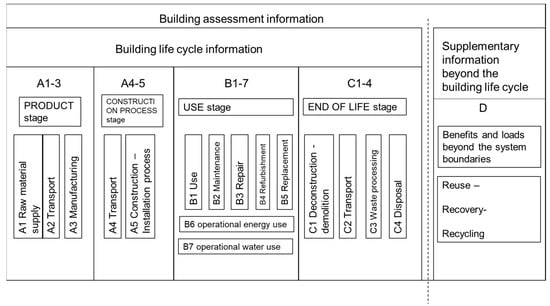 Figure 1 illustrates that during the production stages (A1–A5) (see Figure 2) the added embodied environmental impact (AEEI) increases due to the environmental impact that is related to construction materials, transport, and the building process. Then, as the energy refurbishment is made the environmental impact decreases compared with the environmental impact of the original building. The change in the operational environmental impact (ΔOEI = OEIunrefurbished – OEIrefurbished) would compensate (or increase) the total environmental impact. The EP of a building is given as: