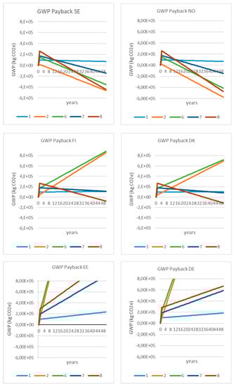 Figure 3 shows the selected scenarios in terms of GWP payback. It can be seen in the figure that there are three different groups with similar GWP impacts but different energy sources. At the top of the figure are Sweden and Norway (SE and NO) that have low carbon electricity mixes, then there are Denmark and Finland (DK and FI) that have moderate carbon intensive electricity mixes, and at the bottom are Estonia and Germany (EE and DE) that have carbon intensive electricity mixes.
