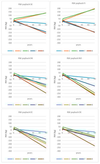 Figure 4 shows the selected scenarios’ RW payback. It can be seen in the figure that there are two different groups that have similar RW impacts, but different energy sources. At the top of the figure are Sweden and Finland (SE and FI) that have high shares of nuclear power, then there are Denmark, Norway, Estonia and Germany (EE and DE) that have low to no nuclear power.