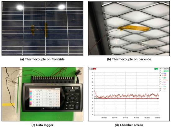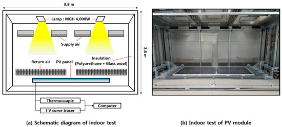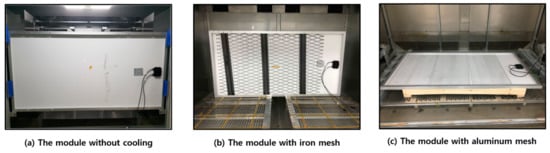 In this study, the cooling effects of the iron and aluminum meshes were evaluated using an International Electrochemical Commission (IEC) standard chamber [15]. The experiments were performed under standard test conditions (STC), i.e., an ambient temperature of 25 °C and solar irradiation of 1000 [16]. The chamber (Figure 2) had a dimension of approximately 2600 (width) × 2200 (depth) × 1800 (height) mm. Four lamps (MGH 4000 W) were used to reproduce the solar irradiance. The reproducible irradiance range was 800–1200 at wavelengths of 280–3000 nm. The total area exposed to solar irradiance was 16,000 (Table 2). The specifications of the PV module installed in the solar simulator are shown in Table 3. A thermocouple and I-V curve tracer were used to measure the temperature distribution and power generation of the PV module (Figure 3). To ensure a uniform irradiation, the thermocouples were attached to the same three points on the frontside and backside of the module. The data were recorded as the average of three measurements. (Figure 4) To analyze the change in the power generation efficiency due to cooling, the cell temperature () was taken as the average of the frontside and backside module temperature (Equation 1). The power generation efficiency () of the PV module was calculated by using the maximum power output per square meter (P) and solar irradiance (G) measured by the I-V curve tracer (Equation 2).