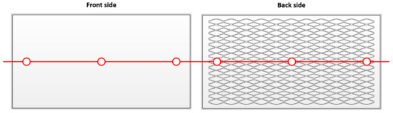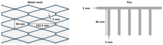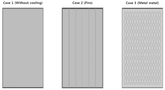 A CFD simulation was performed on the PV modules without cooling, with fins, and with metal mesh (Figure 10). All three cases applied PV modules of the same specification, and all physical parameters were identical except for the cooling technologies attached to the bottom of the module (Figure 11). The parameters of the metal mesh were obtained from the manufacturer (described in Section 2.2), while those of the fins were obtained from a previous study [18].