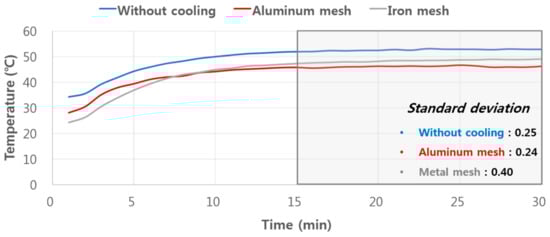 The experiments were performed under STC (25 °C), and the temperatures on the backside of the PV modules were monitored for 30 minutes. The temperature of the different modules became stable after 15 min (Figure 7). The temperature of the modules without cooling, with iron mesh, and with aluminum mesh, stabilized at 52.9 °C, 49.0 °C, and 46.3 °C, respectively. cooling, the modules with iron and aluminum meshes exhibited an improvement in power The average temperature of the modules from 15–30 minutes was 52.7 °C, 48.4 °C, and 46.2 °C, respectively (Table 4). This implies that the cooling effect of the iron and aluminum meshes was 4.35 °C and 6.56 °C, respectively, in terms of the temperature difference. Consequently, the power generation efficiency of the modules also increased as their temperature declined (Table 5). Compared to the module without generation efficiency by approximately 0.11% and 1.44%, respectively. Although the contact surface area of the iron mesh was larger than for the aluminum mesh, the cooling performance of the iron mesh was lower than for the aluminum one, because incomplete contact between the backside of the module and the iron mesh likely had a substantial effect on its cooling performance (Figure 8).