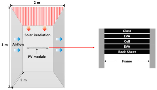 To analyze the cooling performance of both the fins and metal mesh attached to the backside of a PV module, a three-dimensional and steady-state model that can perform a radiant heat transfer analysis was constructed using Star , a commercial computational fluid dynamics (CFD) simulation tool. The model simulated a PV module located at the center of an air-filled chamber (2 m 3 m 5 m), with constant airflow to maintain a stable ambient temperature similar to that of an actual indoor solar simulator. The boundary conditions were set so that the frontside of the module was vertically exposed to solar radiation (Figure 9). Since the model consisted of multiple layers, a polyhedral mesher capable of a multi-region conformal mesh was applied as the volume mesh. A prismatic layer mesh was applied on the surface of the module to ensure the accuracy of the heat transfer analysis at the air-cell. A thin mesher was applied to prevent the excessive formation of cells on the plate.