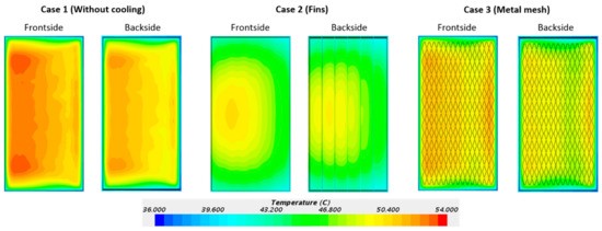 - The simulations suggested that the heat transfer area at the backside of the module had a substantial impact on the cooling. The cooling fins had a larger heat transfer area than the metal mesh and thus exhibited a superior cooling effect.
