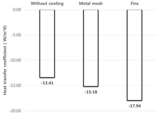 The results demonstrate that the PV module can be cooled by attaching fins or metal mesh (Figure 12). The cooling fins performed better than the metal mesh. Particularly, for the metal mesh, the average temperature of the cell decreased by 1.49 °C, whereas for the fins the temperature decreased by 3.18 °C (Table 9). The most important factor affecting the cooling performance was the heat transfer area under the module. The simulation was performed under the assumption that both the metal mesh and the fins were completely in contact with the bottom of the module and that there was therefore no thermal contact resistance. Accordingly, the results indicate that under a similar heat transfer area, the cooling performance of fins was superior to that of the metal mesh. The heat transfer coefficient on the backside of the module was proportional to the heat transfer area. The module with fins had the highest heat transfer coefficient. (Figure 13).